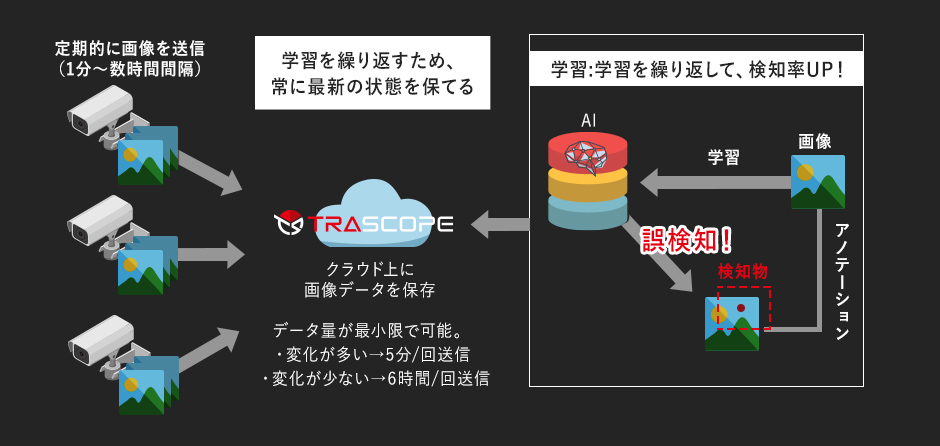 - 検知したときに、管理者に通報します。現場に行かなくても管理画面からライブ映像の確認が可能。