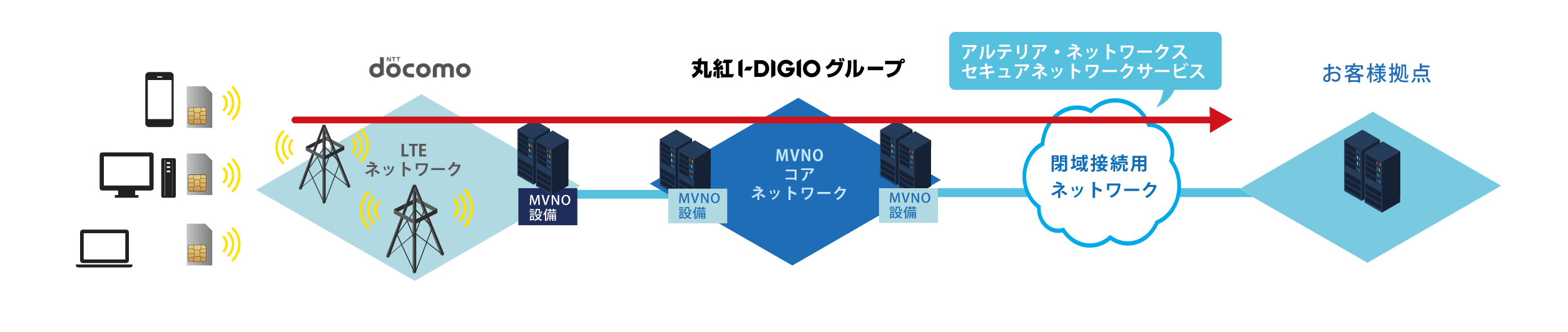 閉域接続サービスとは、丸紅I-DIGIOグループが提供するコアネットワーク(閉域網)とお客様拠点を閉域接続用ネットワークで接続することで、端末(SIM)とお客様拠点のセキュアな通信を実現するサービスです。