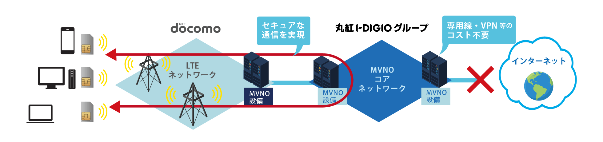 モバイル閉域網サービスとは、インターネットを経由せずに丸紅I-DIGIOグループが提供するコアネットワーク(閉域網)内で端末(SIM)間のセキュアな通信を実現するサービスです。