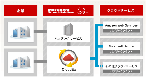 クラウド接続サービス「CloudEx」のイメージ構成図をご紹介しております。お客様の環境に最適なパブリッククラウドをご提供いたします。